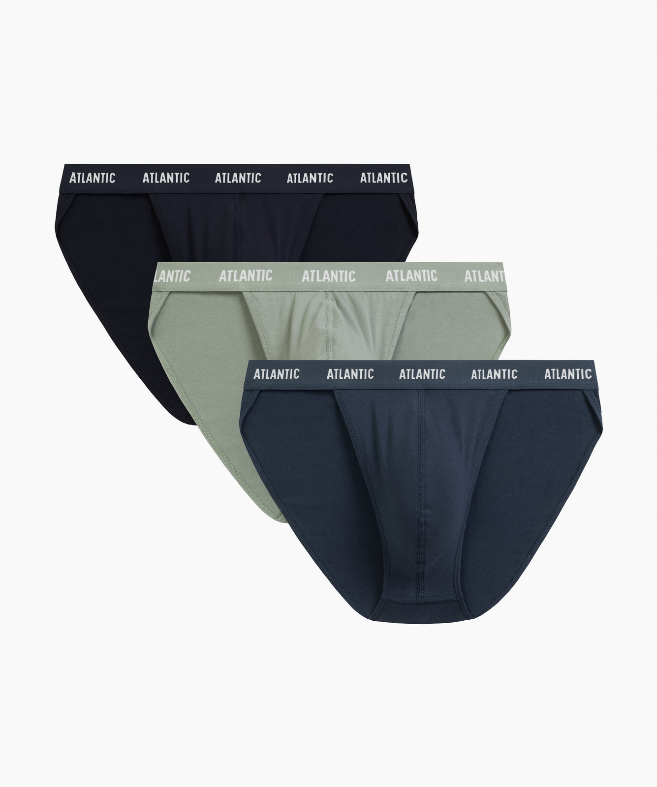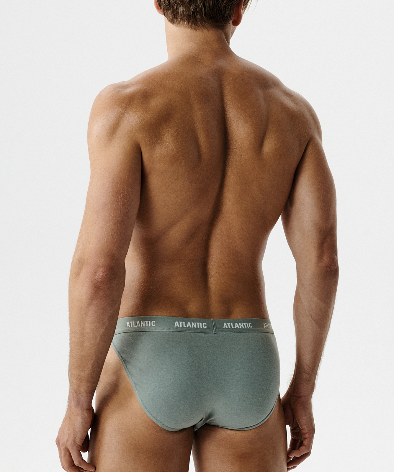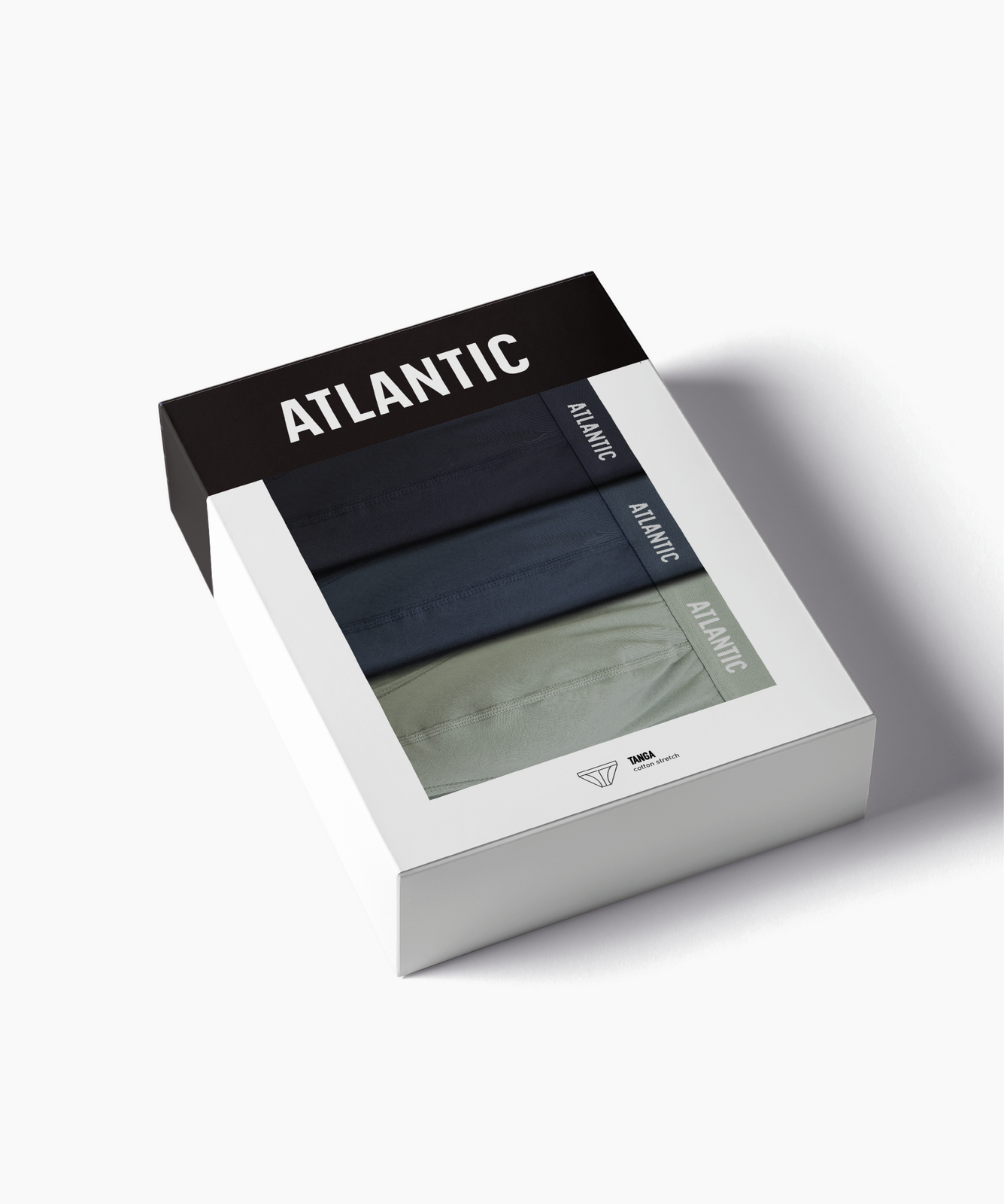 Набор из 3 шт. мужских трусов-слипов Atlantic темно-синего, светло-зеленого и сине-зеленого  цвета. Мужские классические однотонные трусы-танга 3MP-1576 от польского бренда Atlantic на каждый день: превосходно подойдут абсолютно любому мужчине как для повседневной носки, так и для занятий спортом. Анатомический крой этой модели гарантирует идеальную посадку по фигуре и максимальный комфорт. Внешняя пришивная резинка не давит, не скручивается и не натирает при носке, кроме того она же является и боковой частью нижнего белья, высоко открывая бедра. Облегающие мужские трусы слипы имеют низкую линию талии, поэтому могут подойти к любому типу одежды, например, к брюкам или джинсам с заниженной талией. В составе используется мягкий, приятный на ощупь хлопок в сочетании с эластаном. В упаковке представлено трое трусов брифов в различных вариантах расцветок, брендированная резинка из микрофибры выполнена в контрастных цветах и обеспечивает приятные тактильные ощущения для кожи. Кроме того, в нашем интернет-магазине Вы сможете приобрести трусы танга Атлантик 3MP-1576 из наличия по самым выгодным ценам. Стильная фирменная упаковка нашего нижнего белья помогут однозначно сделать Вам верный выбор!