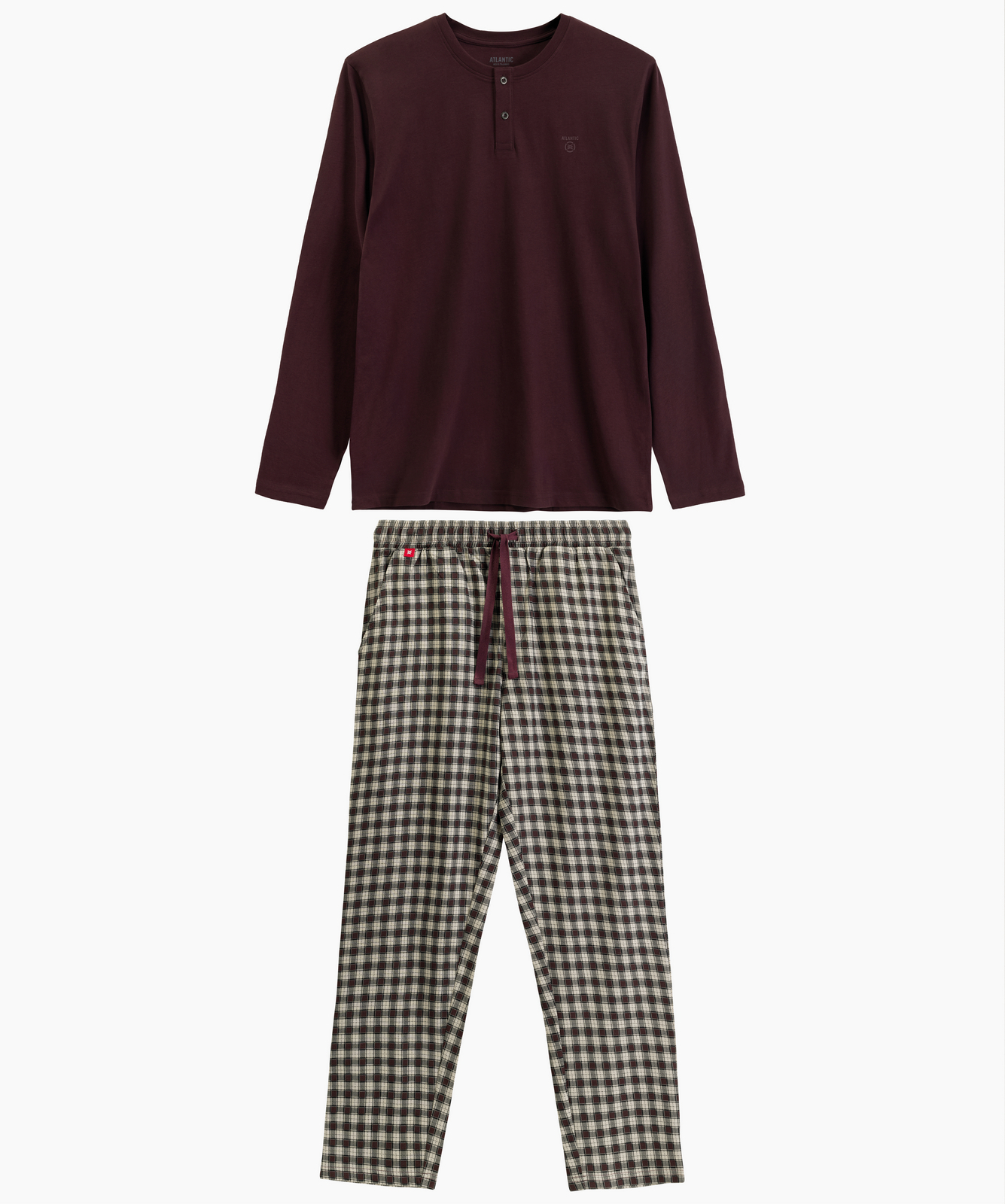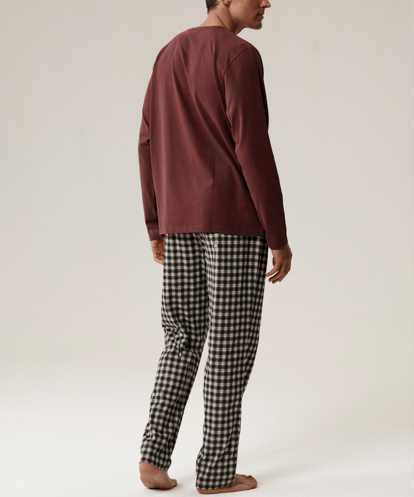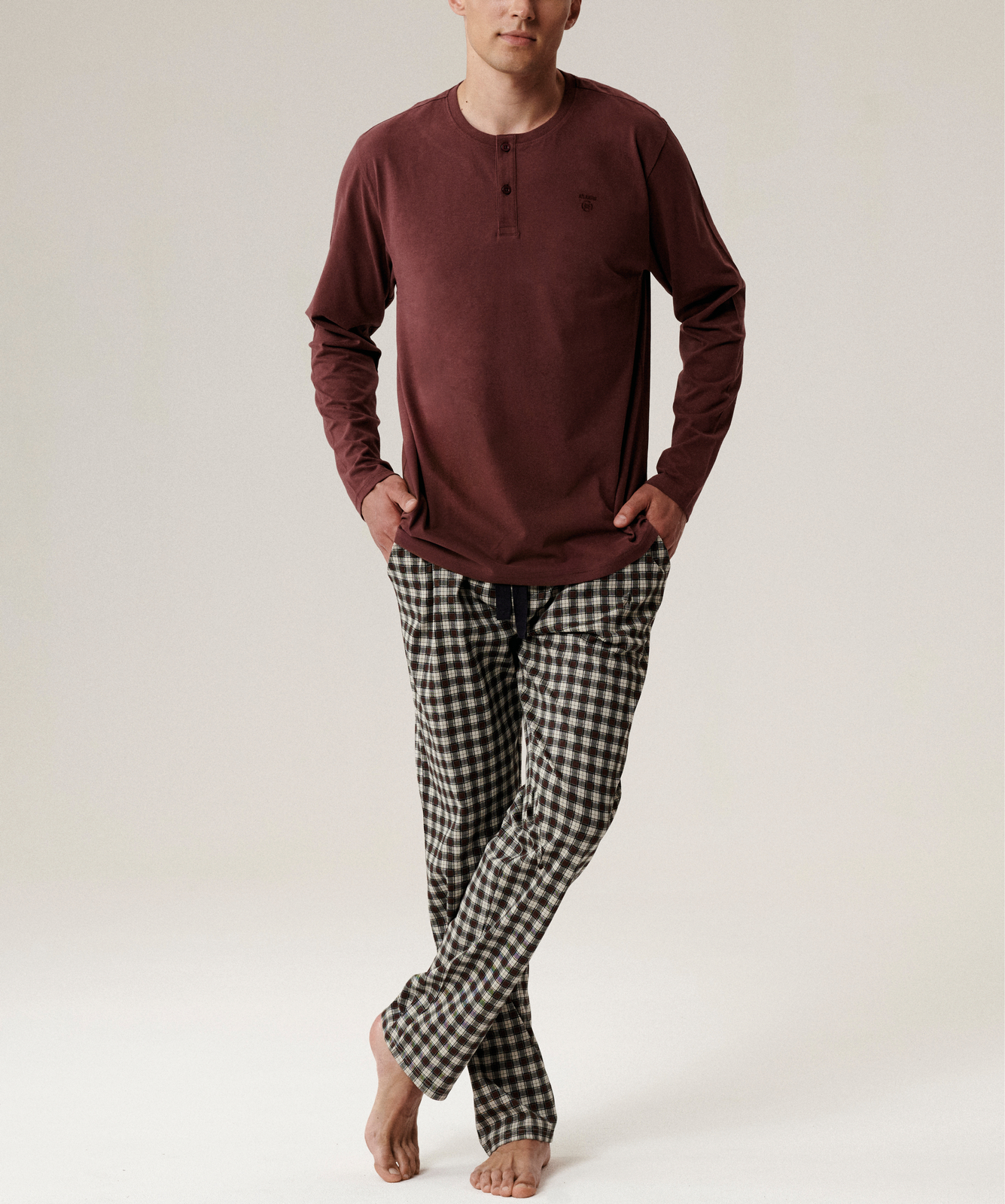 Мужская пижама Atlantic винного и серого цвета из коллекции домашней одежды. Коллекция Homewear польского бренда Atlantic - это мужская одежда для домашнего отдыха и сна, которая представлена как готовыми пижамными комплектами (мужские пижамы с брюками и лонгсливом с длинным рукавом, со штанами и футболкой с коротким рукавом, с шортами и футболкой), так и отдельными предметами одежды для дома, которые можно сочетать между собой на свой вкус (пижамные брюки, шорты и футболки самых разных фасонов и расцветок). Мужской пижамный комплект NMP-394 от польского бренда Atlantic превосходно подойдет абсолютно любому мужчине на каждый случай жизни - не только в качестве пижамы для отдыха и сна, но и для повседневной носки вне дома. Фасон этой модели гарантирует идеальную посадку по фигуре и максимальный уровень комфорта. Стильная мужская пижама, состоящая из лонгслива с небольшой брендированной надписью на груди и штанов свободного, прямого кроя с классическим рисунком в виде клетки. Лонгслив имеет удобный круглый вырез и дополнен застежкой на пуговицах у горловины. Пояс штанов на резинке, объем талии регулируется с помощью завязок. Мягкий хлопок в составе данной модели мужских пижам очень приятен к телу и позволяет коже дышать. Идеально подходит для повседневной носки и в качестве подарка друзьям и близким. Специально для коллекции Homewear трикотажное хлопковое полотно подвергается процессу "вычесывания" и становится более прочным по сравнению с обычным хлопком. Также ткани придается эффект бархатистой поверхности "Peach Effect": поверхность хлопка покрыта едва заметным пушистым ворсом, напоминающим бархатистую кожицу персика, что гарантирует максимально приятные тактильные ощущения для тела. Устойчивость хлопкового волокна к высоким температурам и растяжению позволяет изделию надолго сохранить свой внешний вид и потребительские свойства, а благодаря способности ткани быстро поглощать воду, проблема чрезмерного потоотделения Вас не коснется. Пижамная одежда Атлантик будет превосходным подарком для мужчин всех возрастов: молодым парням и подросткам подойдут модели в яркой цветовой гамме и с паттерном или рисунком, более взрослым мужчинам - в сдержанных или строгих цветах, хотя иногда можно нарушить правила и поэкспериментировать. Кроме того, в нашем интернет-магазине Вы сможете приобрести мужскую пижаму Атлантик NMP-394 из наличия по самым выгодным ценам. Широкая размерная сетка с самыми популярными (от S до XXL) и большими (3XL, 4XL) размерами, а также стильная фирменная упаковка станут для Вас приятным бонусом и помогут однозначно сделать Вам верный выбор!
