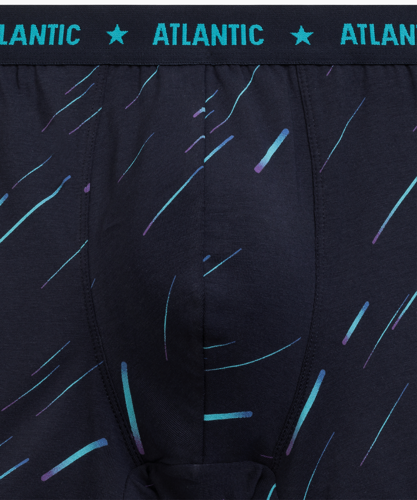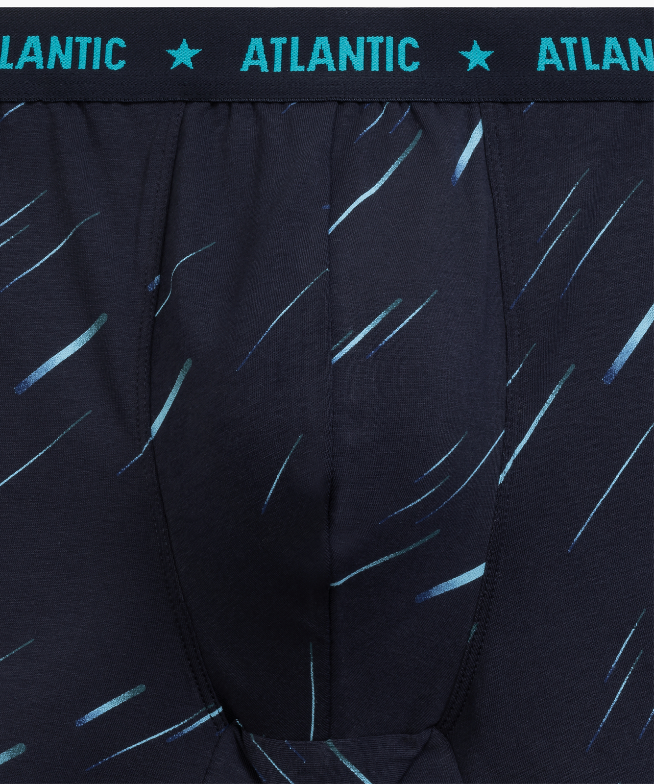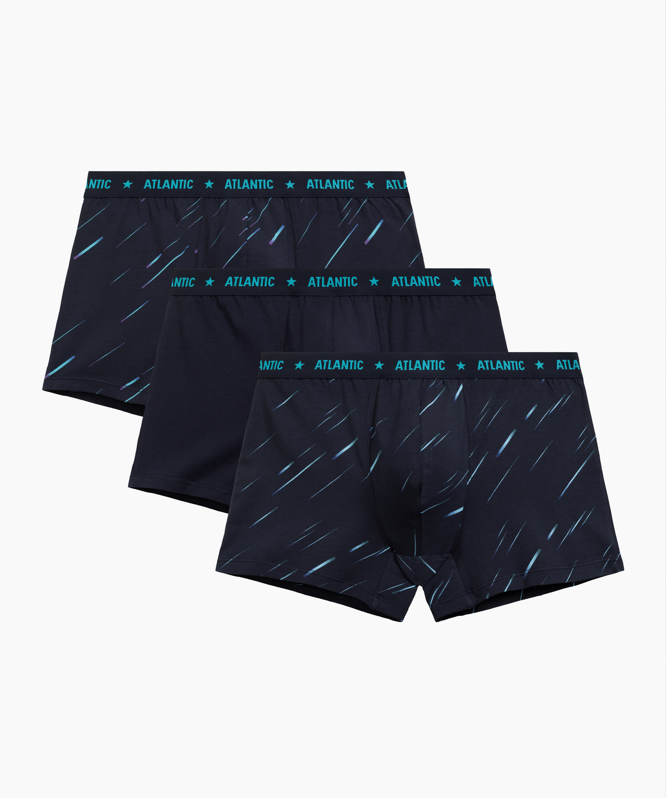 Набор из трех мужских трусов-шорт Atlantic темно-синего цвета — практичное решение для повседневной носки и активного образа жизни. Модель 3MH-224 от польского бренда Atlantic включает одну однотонную пару и две с контрастным динамичным принтом, что позволяет разнообразить мужской гардероб. Изделия выполнены из мягкого хлопка с добавлением эластана, который обеспечивает идеальную посадку по фигуре и сохраняет форму даже при интенсивных нагрузках.