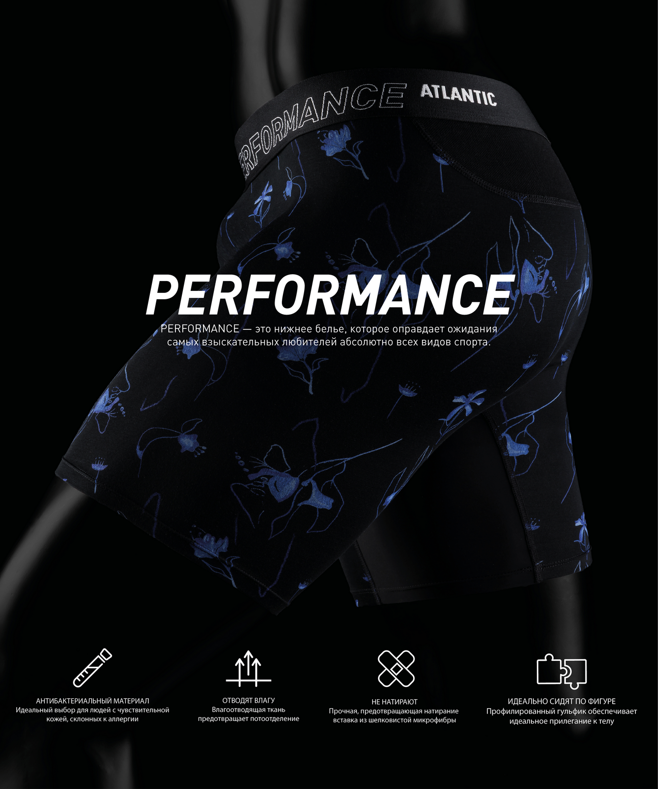 Мужские трусы-шорты удлиненные Atlantic темно-синего цвета из премиальной коллекции. Коллекция Premium - это выбор взыскательных мужчин, которые делают ставку на высочайшее качество, уникальный дизайн и инновационные технологические решения. Мужские трусы-шорты MH-1207 от польского бренда Atlantic относятся к линии спортивного нижнего белья Performance, которая создана специально для мужчин, ведущих активный образ жизни, для которых спорт играет не самую последнюю роль. Нижнее белье Performance подойдет абсолютно любому мужчине для активного занятия спортом (например, фитнеса, бега, силовых и физических нагрузок), однако его также можно использовать и для повседневной носки. Анатомически выверенный спортивный крой этой модели гарантирует идеальную посадку по фигуре и максимальный комфорт во время занятий спортом. Внешняя пришивная резинка не давит, не скручивается и не натирает при носке. Облегающие мужские трусы шорты имеют среднюю линию талии, удлиненные штанины, усиленный профилированный гульфик и дышащую сетчатую вставку сзади, способную быстро отводить влагу. В составе используется дышащий и мягкий бамбук в сочетании с эластаном. Бамбуковое волокно является экологичным и натуральным материалом, который обладает антибактериальными и терморегулирующими свойствами (в жаркую погоду дарит ощущение прохлады, а зимой согревает и позволяет удерживать тепло). Нежный и мягкий на ощупь, бамбук очень похож на шелк, в то же время не уступает в прочности и устойчивости к пиллингуемости других материалам премиального сегмента. Такой материал не вызывает аллергии, поэтому изделия из бамбука часто рекомендуются людям с чувствительным типом кожи. Даже после многих стирок бамбук сохраняет свою мягкость и цвет, поэтому нижнее белье из бамбука не теряет своего внешнего вида и потребительских свойств долгое время. Данная модель мужского нижнего белья представлена в черной расцветке с абстрактным цветами, а брендированная резинка из микрофибры обеспечивает приятные тактильные ощущения для кожи. Нижнее белье Атлантик будет превосходным подарком для мужчин всех возрастов: молодым парням и подросткам подойдут модели нижнего белья в яркой цветовой гамме и с паттерном или рисунком, более взрослым мужчинам - нижнее белье в сдержанных или строгих цветах, хотя иногда можно нарушить правила и поэкспериментировать. Кроме того, в нашем интернет-магазине Вы сможете приобрести трусы шорты Атлантик MH-1207 из наличия по самым выгодным ценам. Широкая размерная сетка с самыми популярными (от S до XXL) и большими (3XL, 4XL) размерами, а также стильная фирменная упаковка нашего нижнего белья помогут однозначно сделать Вам верный выбор!